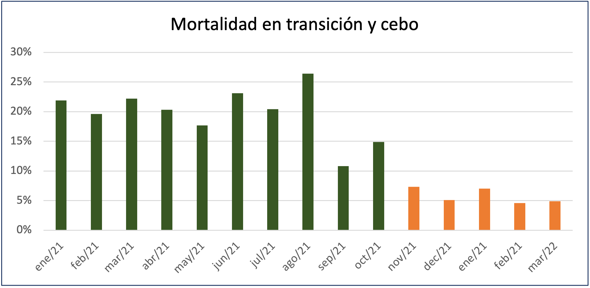 Gráfico 1 – Mortalidad mensual (fase 2 + fase 3) en ambos grupos: vacunados con una VVM contra el PRRSV2 (verde) o con UNISTRAIN® PRRS (naranja). Las diferencias fueron estadísticamente significativas (p < 0,001; regresión logística). Adaptado de Dong Noh et al., 2023.